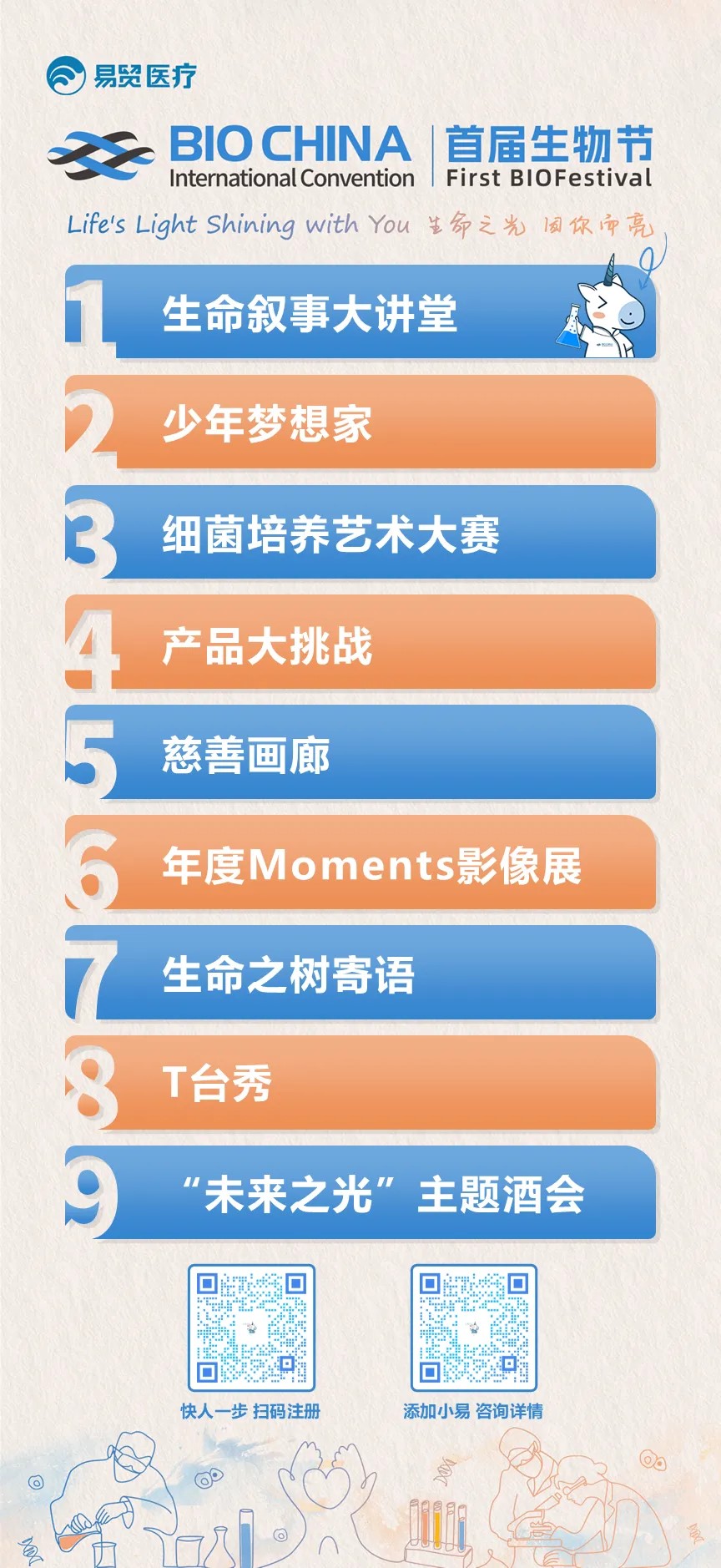BIOCHINA2026举办期间,“生命之光,因你而亮”—— BIOCHINA首届生物节同期举办!现场将开展“生命叙事大讲堂”、“少年梦想家”、“细菌培养艺术大赛”、“产品大挑战”、“未来之光主题酒会”、“T台秀”等活动,并设置“慈善画展”、“生命之树”、“年度Moments影像展”等专区,以情感链接科技与生命。