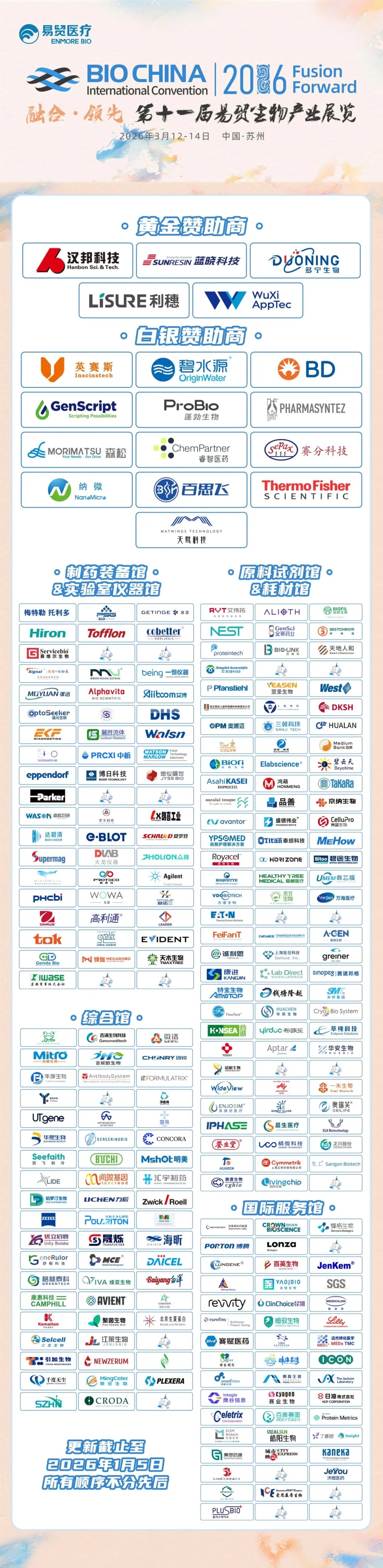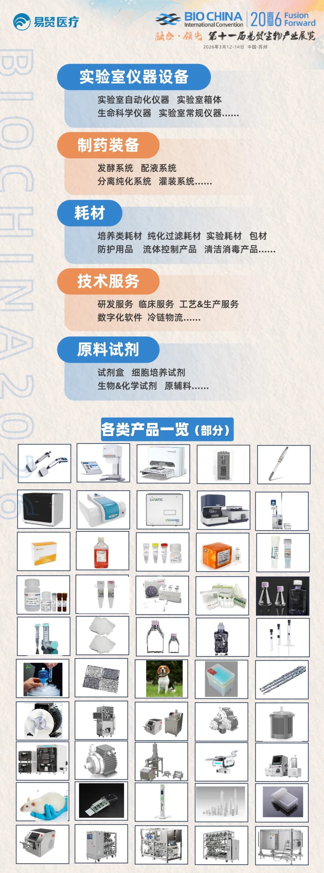 BIOCHINA2026(第十一届)易贸生物产业展览将于3月12-14日在苏州举行,现场将邀请30000+参会观众,40+海外国家和地区,850+演讲嘉宾,设置250+细分论坛,3000+约见达成,400+展商参展。