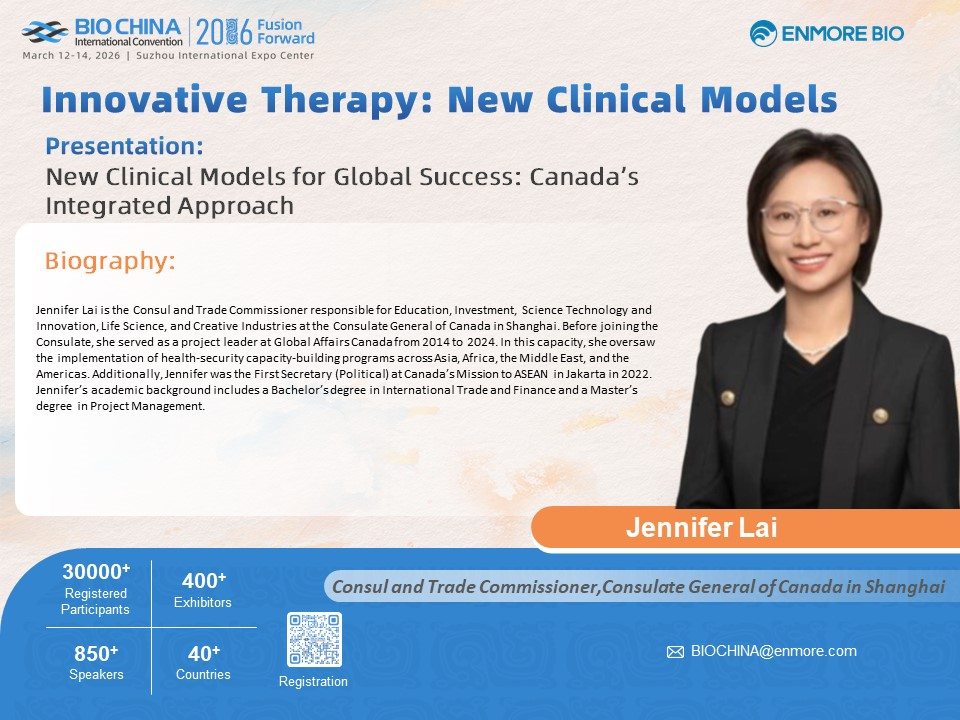 3月13日,在全球临床开发论坛中,来自Consulate General of Canada in Shanghai的Consul and Trade Commissioner Jennifer Lai将以《报告:面向全球成功的新临床模式:加拿大的一体化实践》为题,做报告分享。