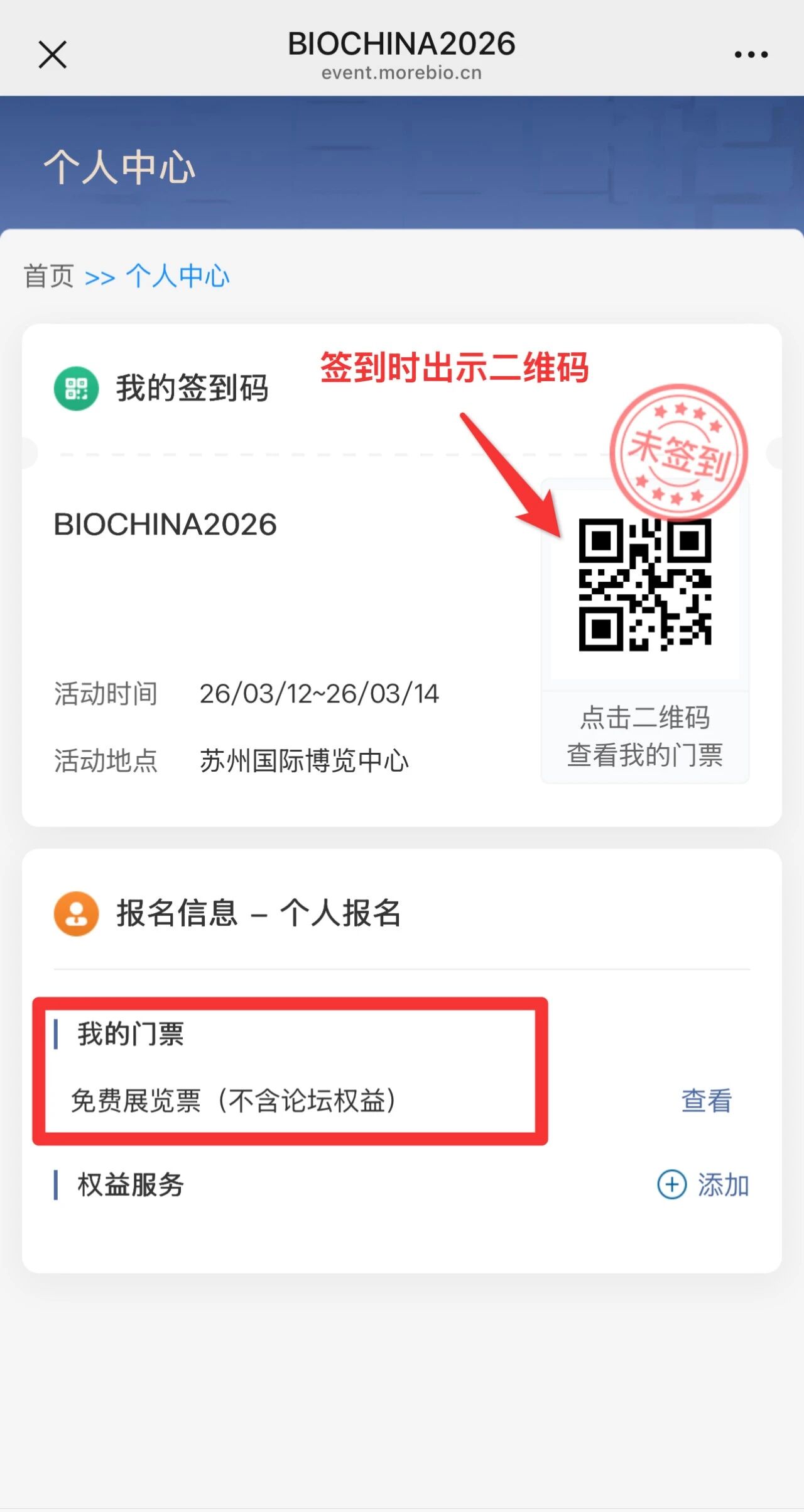 STEP 2:点击“个人中心”,提前确认门票信息及权益