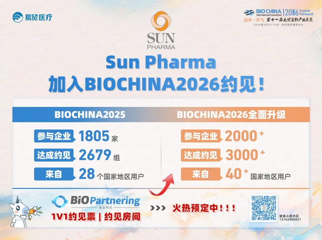 Sun Pharma将亮相BIOCHINA2026(第十一届)易贸生物产业展览,并设立专属约见房间。