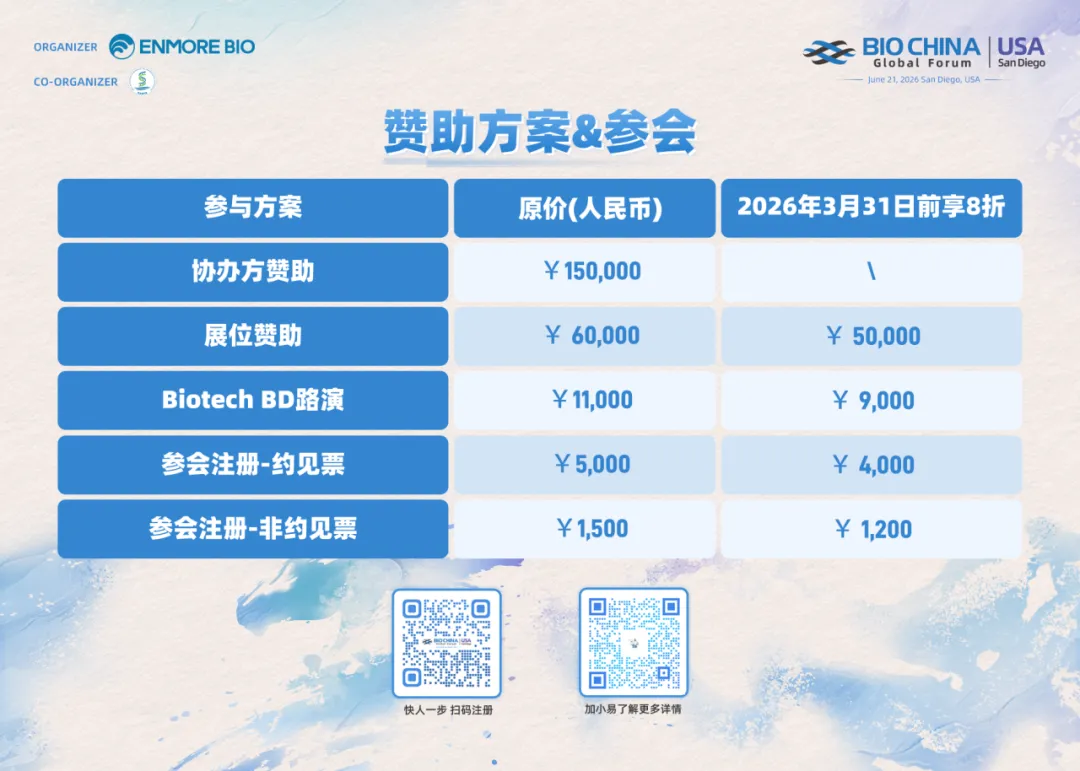BIOCHINA Global Forum @ US 以专业赋能合作,以链接驱动创新。6月21日,诚邀全球生物医药同仁共赴圣地亚哥,携手抢占跨境产业新机遇,书写协同发展新篇章!目前,BIOCHINA美国 注册通道已正式开启,即刻扫描下方二维码完成报名,抢占早鸟权益,解锁跨境合作新机遇!