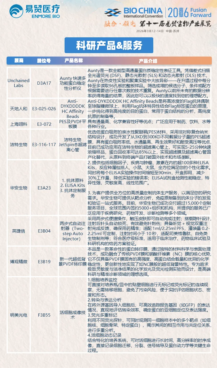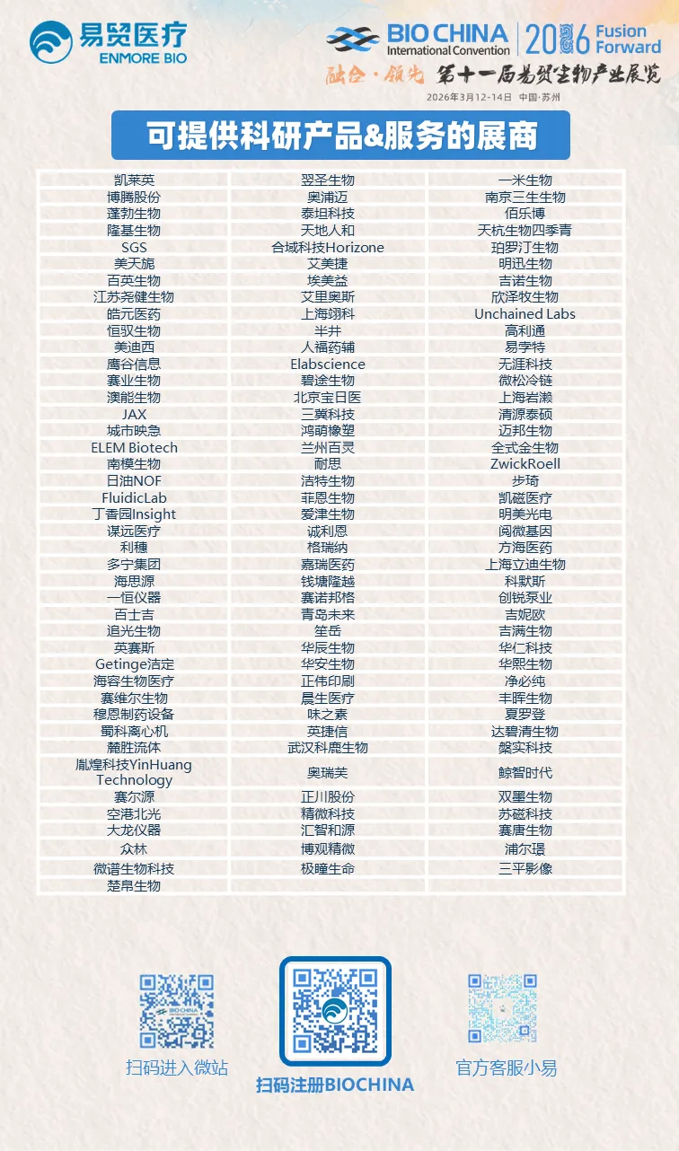BIOCHINA2026(第十一届易贸生物产业展览)将于3月12-14日在苏州国际博览中心举行,立足行业前沿,聚焦科研痛点,展会参展商带来覆盖全产业链的硬核产品、服务赋能科研创新,助力科研工作者打破瓶颈、加速成果转化,为研发之路劈开捷径。