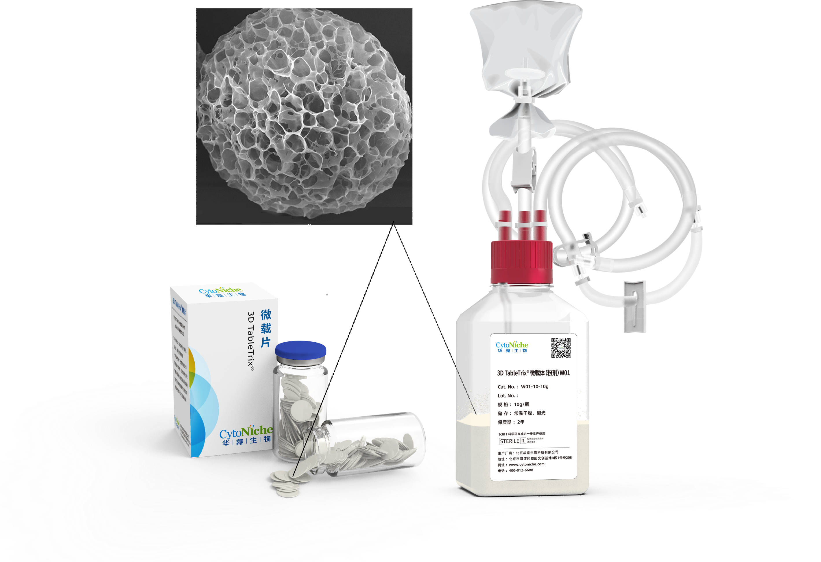 3D TableTrix® 微载体家族为自主研发产品,由数万颗弹性三维多孔微载体组成,孔隙率>90%;粒径大小可控于50-500μm区间,比表面积大,可实现细胞高密度生产;均一度≤100μm;具备特异性降解技术,可温和收获细胞,形成真正的3D仿生培养。